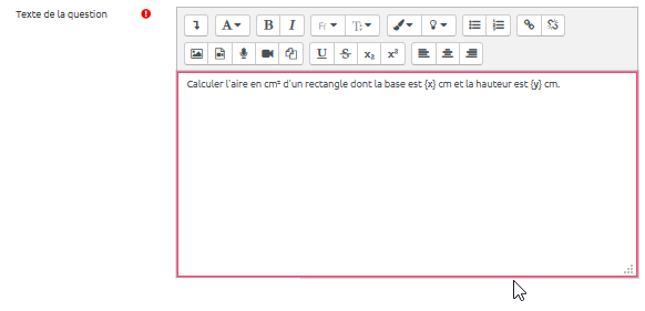 - Indiquer le texte de la question en mettant entre accolades les variables utilisées, ici {x} et {y} :