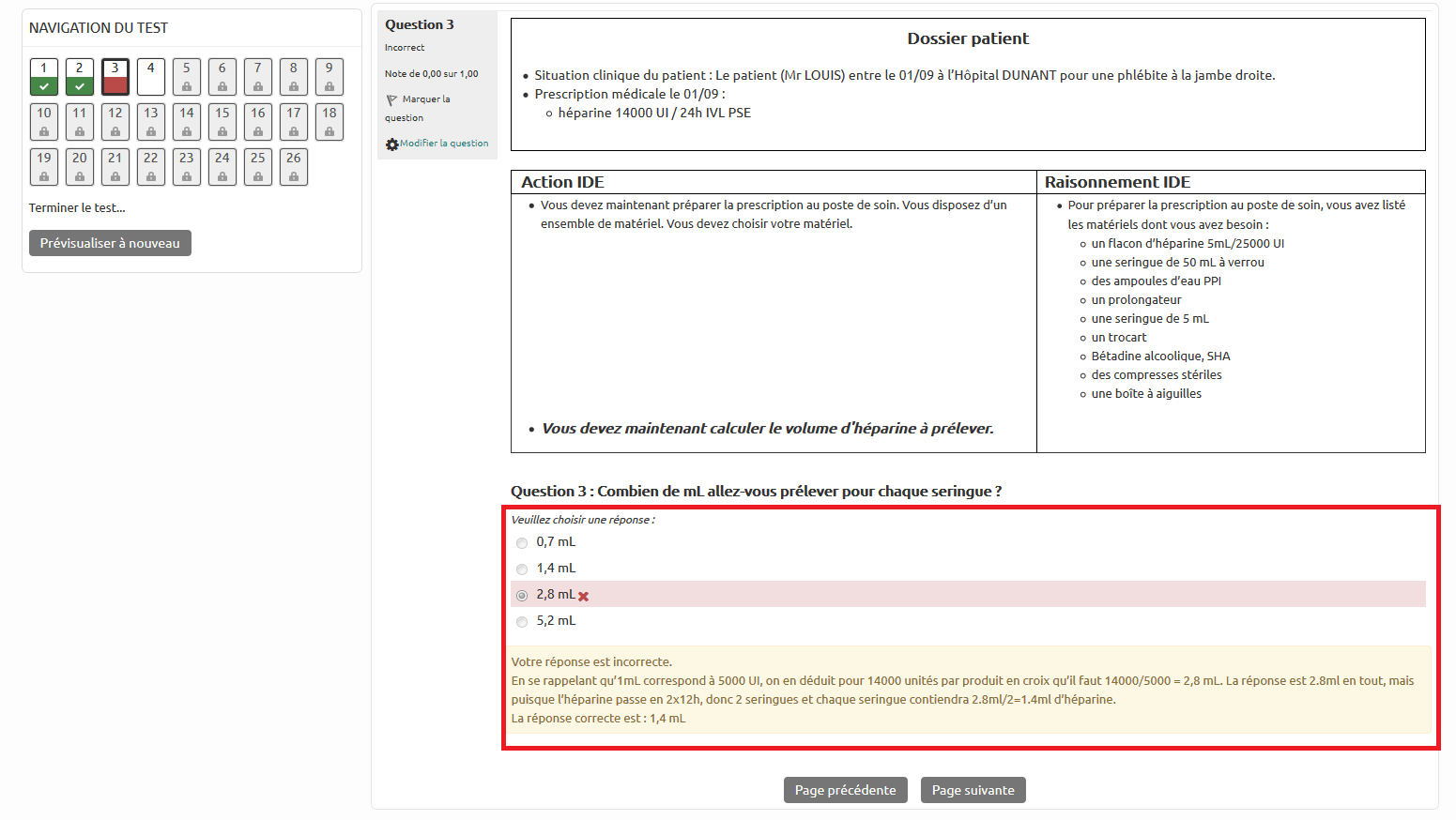 À la fin du test, l'étudiant a accès au feedback global et à la relecture des questions.