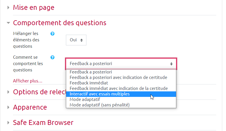 Sur la page de paramètres, nous allons nous intéresser au menu “Comment se comportent les questions” du volet “Comportement des questions”.