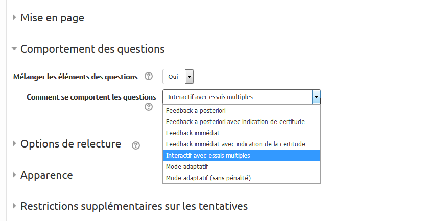 On sélectionne l'option “Interactif avec essais multiples” dans le menu des paramètres. Avec cette option, les questions du test peuvent être tentées plusieurs fois, avec un indice donné après chaque essai infructueux.