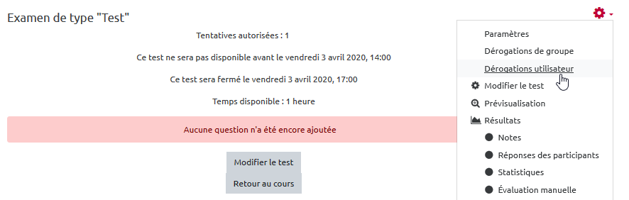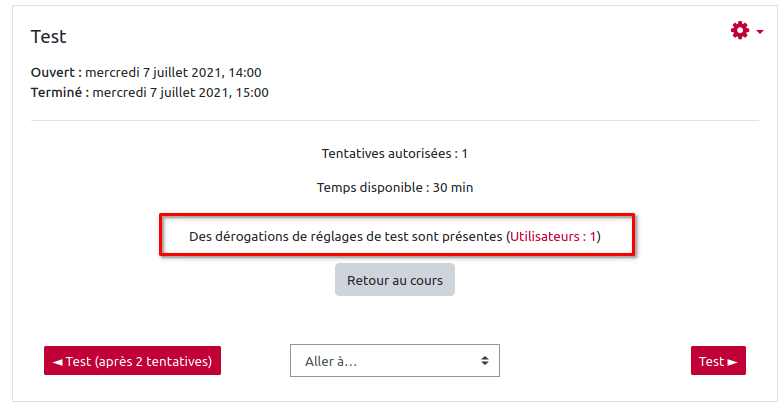 L'interface de dérogation reprend les informations inscrites dans les paramètres du test.