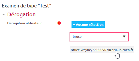 - taper le prénom puis le nom de l'utilisateur bénéficiant d'une majoration de temps, puis cliquer sur la proposition correcte fournie :