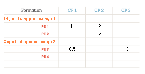 - d'autre part, les catégories de performances (CP) en lien avec les diverses taxonomies (la plus connue étant la taxonomie des apprentissages de type cognitifs de Bloom).