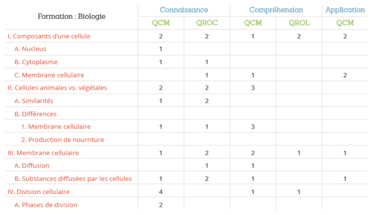 Afin de garantir les qualités docimologiques de l’évaluation, nous vous proposons de construire une table de spécification. C'est un tableau à double entrée comprenant :