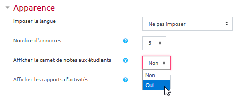 - Sélectionner “Oui” pour afficher le carnet de notes aux étudiants :