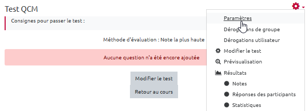 Pour la création des questions, se reporter à la documentation : Créer et gérer une banque de questions.
