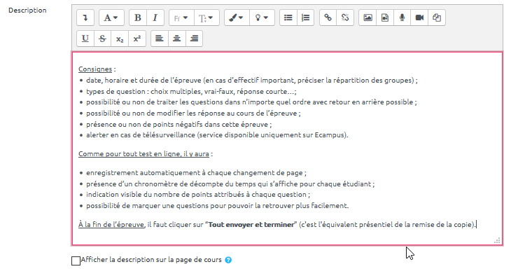 L'épreuve sera intégrée dans un espace de cours (sur Ecampus ou Collégium Santé) dans lequel quelques réglages spécifiques sont nécessaires.