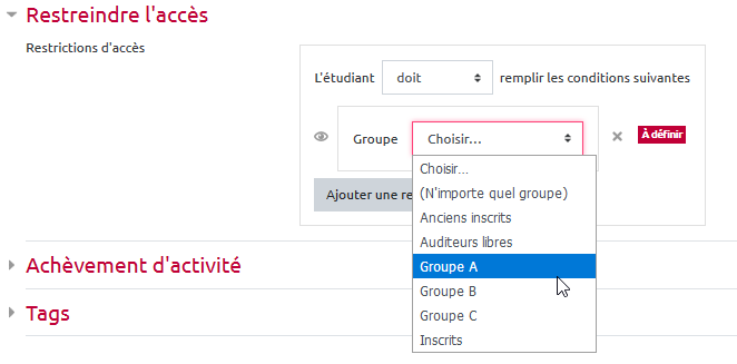 - ajouter une restriction d’accès dans chaque sujet (par exemple : accès au sujet 1 restreint au groupe A) :
