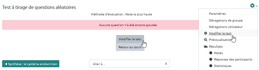 Attention : configurer un tirage aléatoire de questions nécessite d'organiser ces questions par catégories dans la banque de questions : niveau de complexité ou thématique, selon vos objectifs d'évaluation.
