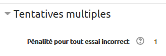 La pénalité appliquée par défaut pour la question de type vrai-faux est de 1. Cela signifie que l'étudiant doit fournir la bonne réponse au premier essai, sous peine de n'obtenir aucun point.