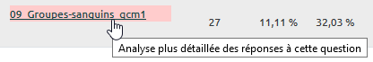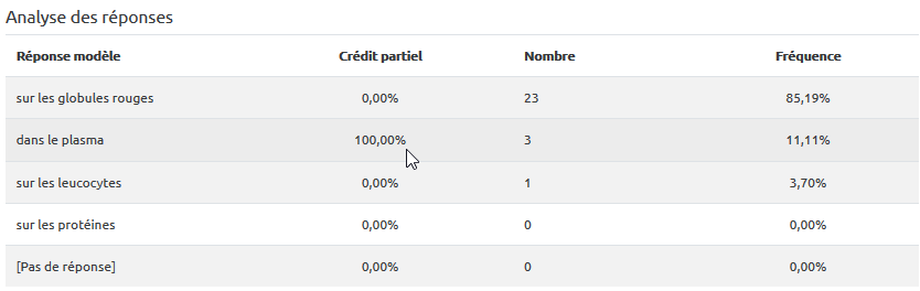 - descendez pour consulter les réponses. Dans cet exemple de type QCM, la réponse attendue était “sur les globules rouges” mais un erreur de frappe lors de la conception de la question a pointé la réponse “dans le plasma” au lieu de la réponse attendue ;