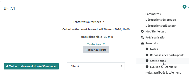 - Dans l'espace de cours, cliquer sur le nom du test puis sur le rouage et enfin sur le sous-menu “statistiques” :