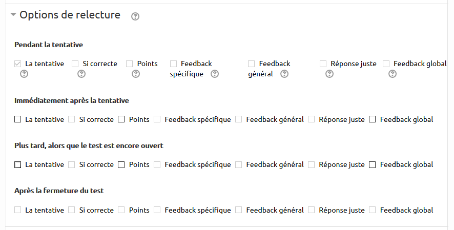 - décocher toutes les options de relecture cochées par défaut de la dernière case à la première en ne laissant coché que “La tentative” dans “Pendant la tentative”