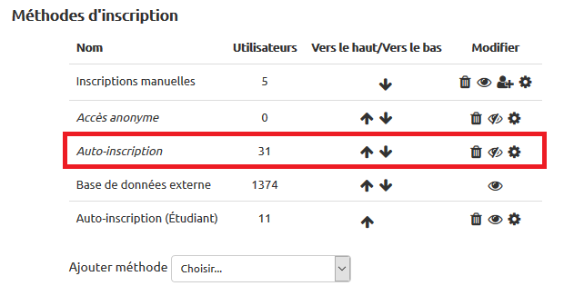 Dans "Administration du cours" / "Utilisateurs" / "Méthode d'inscription" :