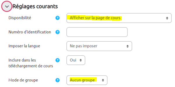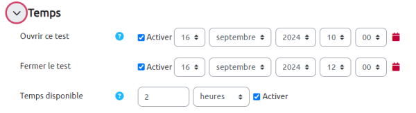 L’accès aux paramètres permet d’ajuster les restrictions notamment au niveau des rubriques Temps pour un test ou Disponibilité pour un devoir, Réglages courants et Restrictions d’accès :