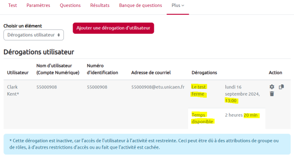 L'étudiant peut disposer d’une dérogation de temps (temps supplémentaire), d’accès ou d’aménagement (tiers-temps et quarts-temps). Celle-ci est visible au niveau de la première page du test.