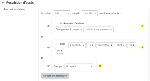 Modifier si nécessaire en supprimant une restriction en cliquant sur la croix à droite de la restriction si celle-ci n’est pas pertinente et bloque l’affichage de l’examen. La restriction peut être modifiée ou supprimée. Enregistrer la modification en bas de la page des paramètres. Si une restriction par groupe est présente, vérifier la cohérence avec le ou les étudiants concernés (doit être présent dans le groupe). S’il y a présence de restrictions d'accès par groupe + par date, vérifier les opérateurs Toutes les conditions/L'une des conditions + ET/OU