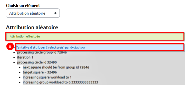 8. Constatez que les travaux ont bien été distribués aux étudiants en regardant le bandeau vert « Attribution effectuée ». Le bandeau bleu indique quant à lui combien de travaux ont été attribués pour chaque étudiant : « X relecture(s) par évaluateur ».