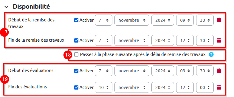 18. Pour gérer les éventuels retards de remise du travail, il est vivement conseillé de laisser la case « Passer à la phase suivante après le délai de remise des travaux » décochée.