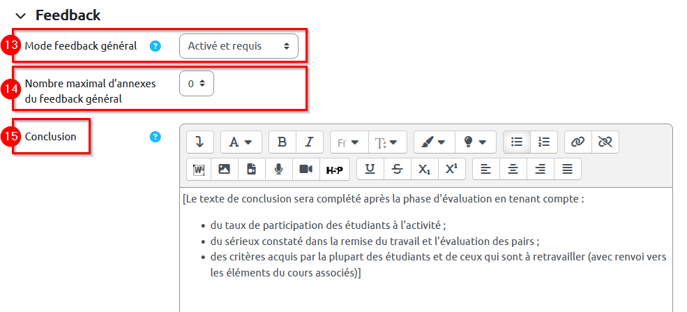 14. Sélectionnez le « Nombre maximal d’annexes du feedback général » s’il est opportun que les étudiants déposent un fichier pour ce feedback (un court fichier audio ou vidéo par exemple).