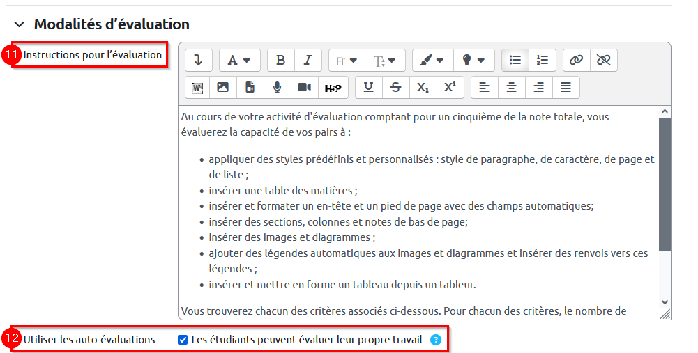 11. À la rubrique « Modalités d’évaluation », renseignez les « Instructions pour l’évaluation ». Ces instructions seront visibles par les étudiants pendant toute la durée de la phase d’évaluation. Elles doivent aider les étudiants à comprendre ce qui est attendu d’eux.