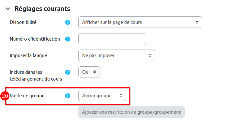 20. Dans les « Réglages courants », vérifiez que le paramètre « Mode de groupe » sélectionné est « Aucun groupe » si l’activité doit être réalisée individuellement.