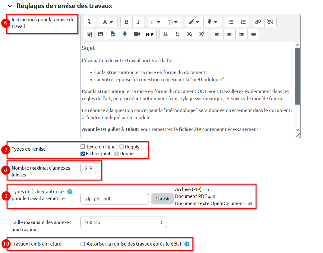 6. Faites défiler la page jusqu’à la rubrique « Réglages de remise des travaux ». Dans l’éditeur de texte, renseignez les « Instructions pour la remise du travail ». Ces instructions correspondent au sujet de l’évaluation. Vous pouvez également préciser aux étudiants comment ajouter leur travail au sein de cette activité.