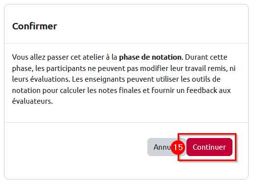 15. Une nouvelle page s’ouvre, confirmez le passage à la phase de notation des évaluations en cliquant sur le bouton gris « Continuer ».