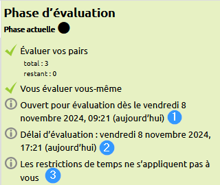Comme l'enseignant, l'étudiant voit le tableau des phases et la phase active. Lors de la phase d'évaluation, l'étudiant voit également le travail qu'il a remis (son titre et la date de dépôt)