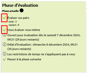 Une coche verte apparaît à gauche de la ligne “Évaluer vos pairs” lorsque tous les travaux attribués à l'étudiant ont été évalués.