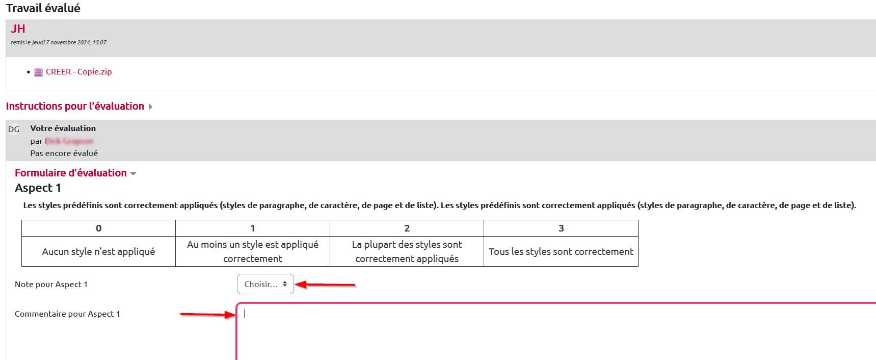 Ensuite, l'étudiant complète le formulaire d'évaluation. Il sélectionne une note (obligatoire) et saisit un commentaire (facultatif) pour chacun des “Aspects”, des critères d'évaluation :