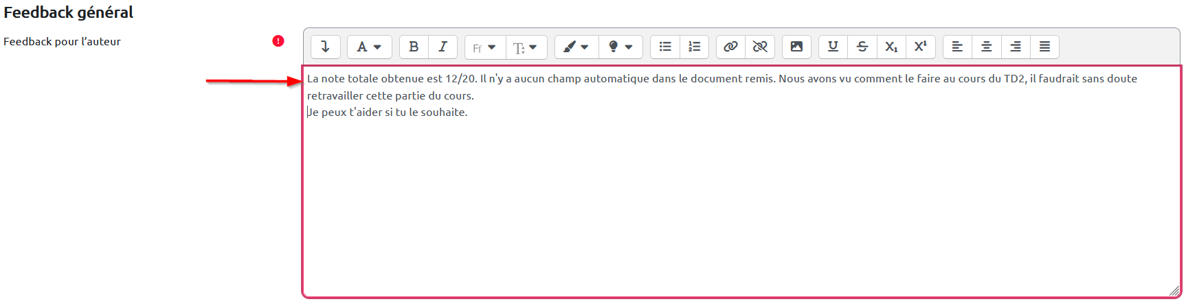 À la fin du formulaire d'évaluation, l'étudiant complète le champ “Feedback général” :