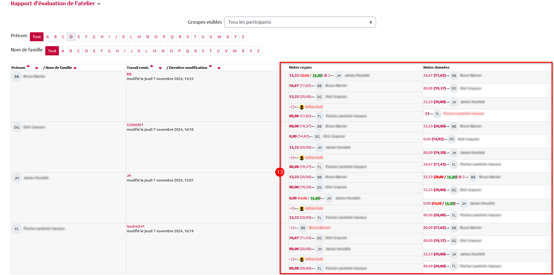12. De retour au tableau « Rapport d’évaluation de l’atelier », chaque note modifiée apparaît en vert dans les colonnes « Notes reçues » et « Notes données ». La pondération est visible sur les mêmes lignes, précédée du signe @.