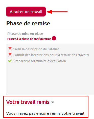Il peut aussi ajouter son travail en cliquant sur la ligne “Remettre votre travail” du tableau des phases. Il doit ensuite cliquer sur le bouton “Ajouter un travail” pour déposer sa production :