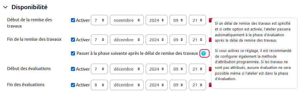 Pour permettre aux étudiants qui n’ont pas participé à la phase de remise d’évaluer les travaux de leurs pairs, cochez la case « Les participants peuvent évaluer sans avoir remis de travail ». Attention : afin d’éviter que des étudiants ne soient pas évalués, il vaut mieux laisser cette option décochée.