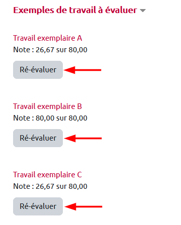 Pour évaluer les exemples de travail, l'étudiant clique sur le bouton gris “Évaluer”, associé à chacun des travaux exemplaires à évaluer.