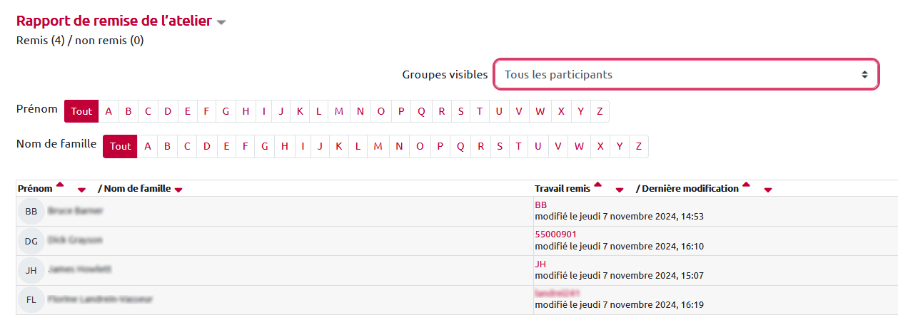 En bas de la page se trouve le « Rapport de remise de l’atelier » avec la liste des étudiants qui doivent remettre un travail. Ce tableau s’actualise tout au long de la phase de remise et vous permet de repérer quels étudiants ont remis leur travail et ceux qui ne l’ont pas encore fait.