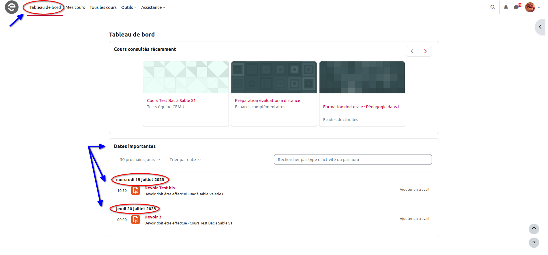 Dans la nouvelle version de Moodle 4 et 4.1, les page Tableau de bord“ et “Mes cours” se trouvent tout en haut dans le menu header. La page Tableau de bord est plus épurée et notamment vidé de la liste « mes cours » qui se trouvent désormais dans la page « mes cours ». Elle contient entre autre une chronologie améliorée (bloc dates importantes) des délais à respecter notamment les activités à réaliser.