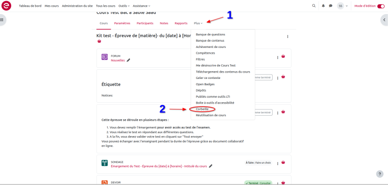 Suite à une suppression accidentelle ou volontaire d'un élément (activité, ressource…etc) dans un espace de cours, il est tout à fait possible, pour un enseignant ou tout autre utilisateur possédant les droits d'édition ou de gestion dans cet espace de cours, de restaurer l'élément supprimé.