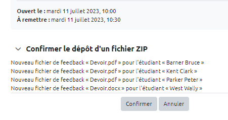 Dans l'interface de visualisation des devoirs, vous pouvez, pour chaque étudiant, lui déposer un fichier de correction de son devoir. Cette opération peut être fastidieuse, car vous les déposez un à un.