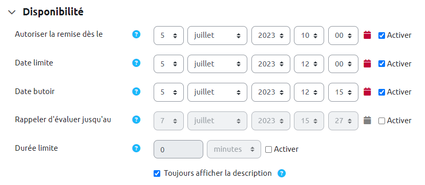 Pour l’utilisation d’un devoir en mode examen (temps très limité), il est important de définir les 3 premières dates et de laisser un créneau suffisant entre la « Date de remise » et la « Date limite ».