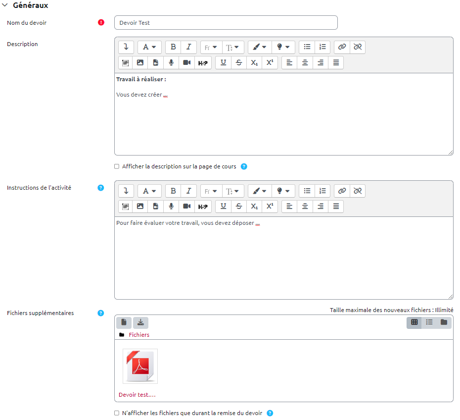 Vous devez tout d’abord renseigner le « Nom du devoir », la « Description » des tâches à effectuer (le sujet) et les instructions de l'activité (actions à effectuer par l'étudiant, message affiché dans la zone de remise du devoir où l'étudiant modifie et envoie son devoir). Le sujet peut aussi être dans un/des fichiers ajouté à la zone « Fichier supplémentaire ».