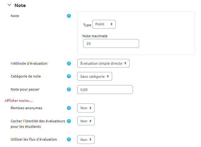 - Note : la note maximale que vos étudiants pourront avoir (si vous notez sur 20, sélectionnez 20, si vous ne fournissez pas de note, sélectionnez “pas de note”).