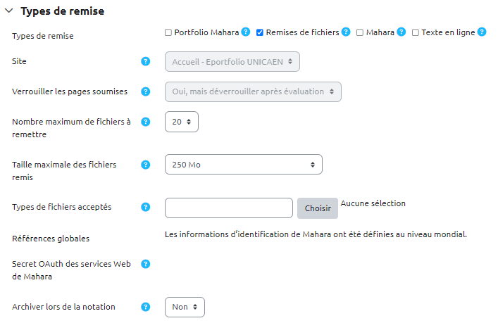 - la taille des fichiers remis (par défaut ce qui autorisé par le site).