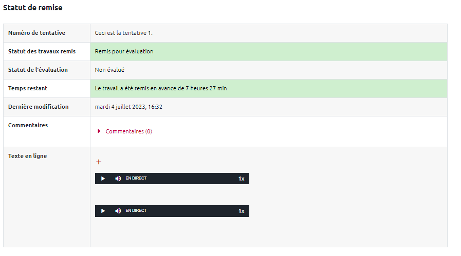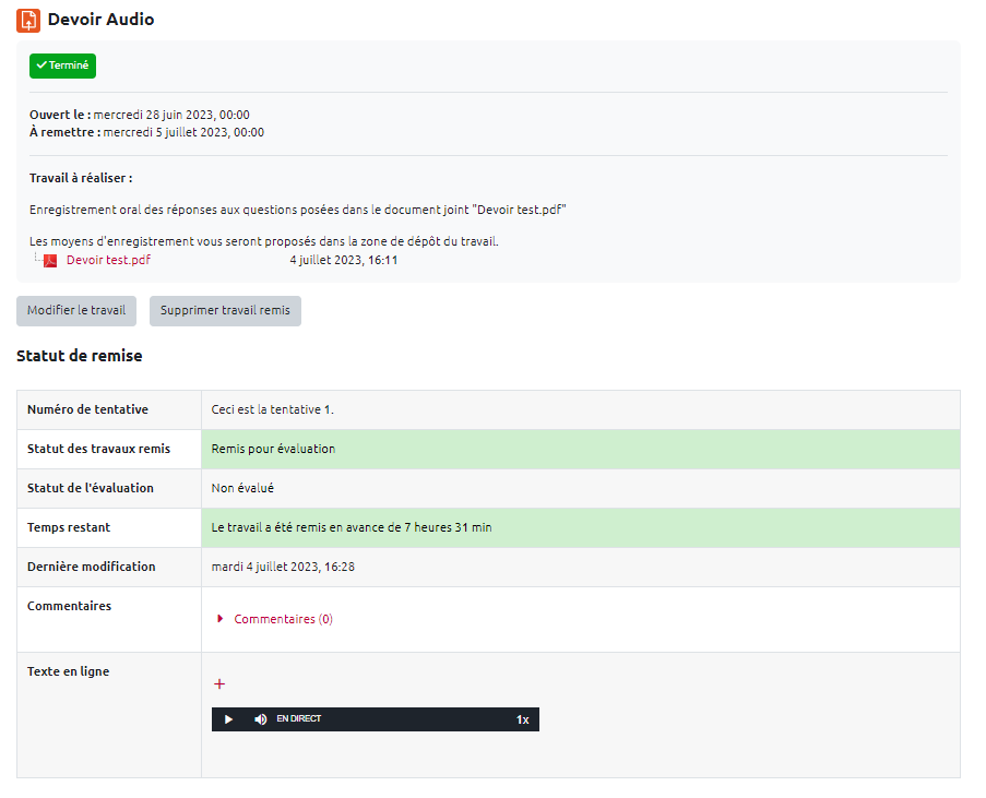 - Il suffit de cliquer sur le bouton “Modifier le travail”, puis de sauter une ligne et de re-cliquer sur le bouton micro. Une fois terminé, il y a aura deux enregistrements :