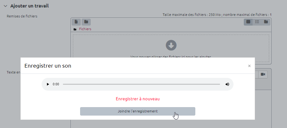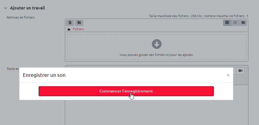 Choisir le format de remise de fichier Texte en ligne. Il arrive parfois que Moodle n'arrive pas à se connecter au micro de l'étudiant, notamment dans le cas d'un navigateur internet ancien ou qui n'est pas à jour. Pour prévenir ce genre de situation, nous vous recommandons d'activer en complément la “Remise de fichiers” pour permettre à un étudiant de déposer un fichier audio en cas de difficulté. Il pourra alors utiliser les outils de son environnement personnel comme l'enregistreur vocal sous windows (pour plus de détails sur ces outils, vous pouvez consulter la page : Production audio et vidéo.