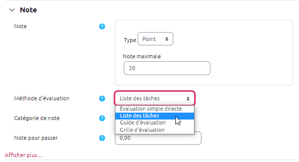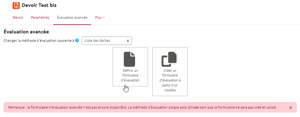 - après l'enregistrement des paramètres du devoir, l'onglet “Évaluation avancée” s'affiche :