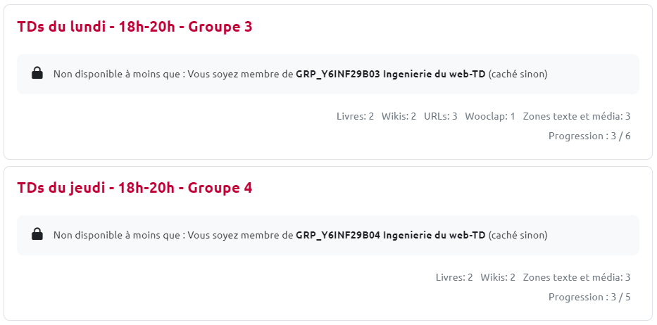 Une mention du contenu et de la progression dans la consultation de celui-ci apparait sur les sections ainsi paramétrées.