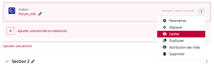 - Créer le forum selon la méthode proposée dans la documentation : Créer un forum en choisissant pour le paramètre « Réglages courants »/« Disponibilité », l'option « Cacher sur la page de cours »