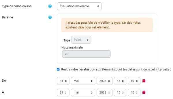 - Dans « Paramètres » puis « Évaluations » (du forum), cliquez sur la case « Restreindre l'évaluation aux éléments dont les dates sont dans cet intervalle » puis indiquez les dates souhaitées